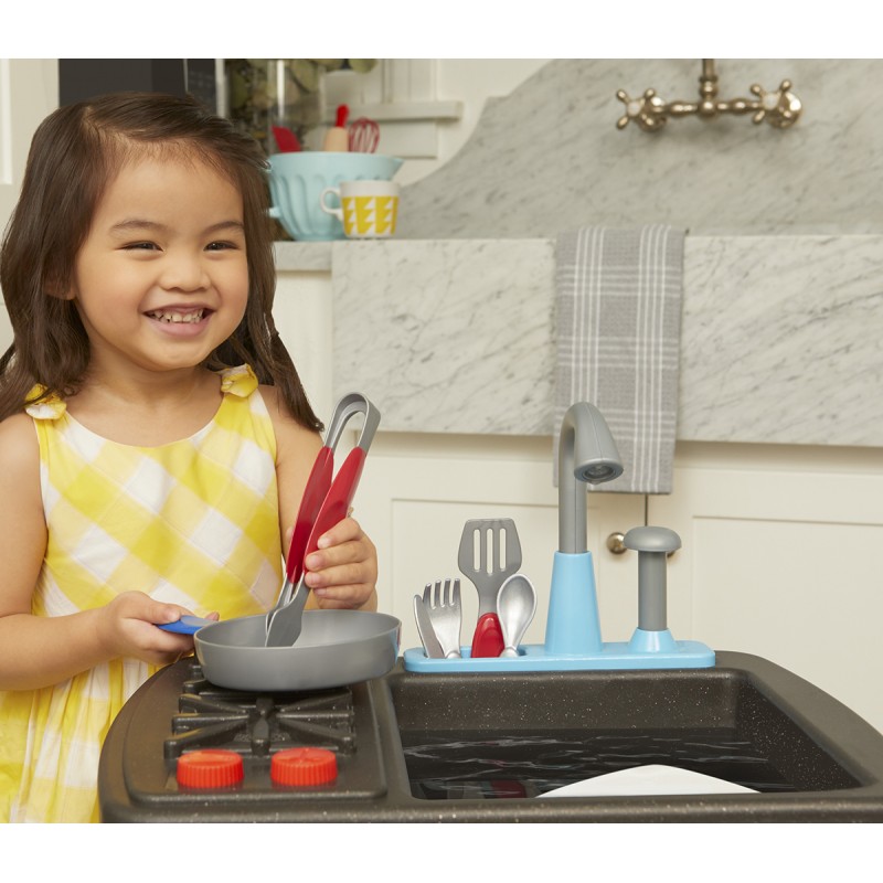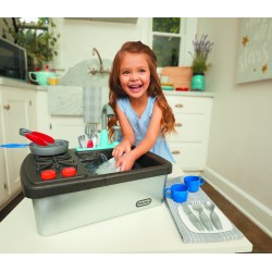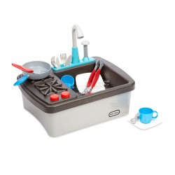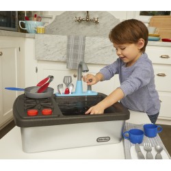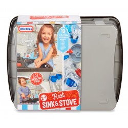 Little ones can pretend to cook and wash dishes just like the grown ups with the realistic Little Tikes® First Sink & Stove. This sleek, modern pretend play combo sink and stove is packed with features: a working water pump, clicking knobs, and more. Plus, it makes realistic sounds when kids turn the knobs on the stove top burners. Pretending to cook, wash dishes, and do other chores helps kids gain a sense of responsibility, an important part of social-emotional learning. The First Sink & Stove fits all 13 included accessories for easy cleanup too. Encourage kids to engage in imaginative pretend play with the First Sink & Stove by Little Tikes®!